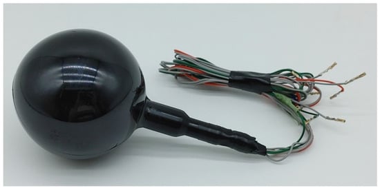 The triaxial accelerometer was placed in the spherical hydrophone after fabrication and characterization of its sensitivity and directivity in air. The spherical housing was fabricated using a 3D printer (ProJet MJP 5500X; 3D Systems, York County, SC, USA) to fill the gap between the accelerometer and spherical hydrophone (Figure 3c). The volume of the housing was maximized to increase structural integrity and leave minimal space for wiring. Then, the signal wires were attached. The gap between the accelerometer and housing was filled with commercial two-part epoxy (Power Epoxy; USCHEM, Seoul, Republic of Korea). The same epoxy was then used to assemble the housing with a pair of hemispherical PZT hydrophones. After assembly, the vector hydrophone was coated with a 4 mm thick polyurethane layer using a soft mold to ensure the isolation of the outer electrode surface from the water (Young Sang Polytech, Incheon, Republic of Korea) as shown in Figure 5.
