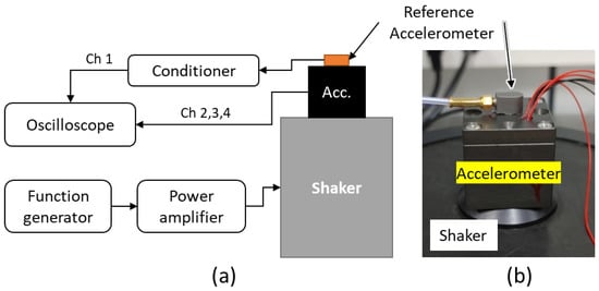 The sensitivity response of the accelerometer to frequency was measured prior to its integration with the spherical hydrophone because the assembly was irreversible. Measurements were performed using a back-to-back method that involved a reference accelerometer (352A59; PCB Piezotronics, Depew, NY, USA) with a known sensitivity of 10 mV/g (Figure 6). Due to the limited surface area of the reference accelerometer, it was placed on top of the proposed triaxial accelerometer. Both sensors were glued to the shaker using cyanoacrylate adhesive and excited together. The measurement was performed three times in each direction; the triaxial accelerometer and reference accelerometer were then detached from the exciter and reglued to measure the other axes. The adhesive residues were removed before gluing so that the thickness of the contact surface remained constant.