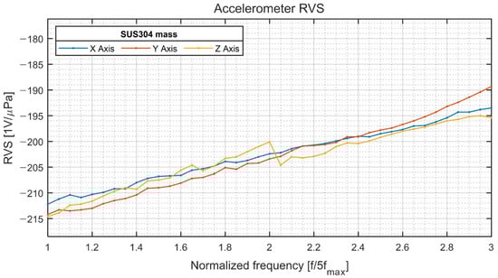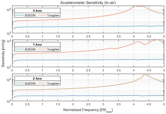 The sensitivity of the triaxial accelerometer was measured in conjunction with a tungsten alloy or stainless-steel (SUS403) seismic mass for comparison. The dimension, density, and measured mass of the seismic mass are provided in Table 5, and the sensitivity measurement results are presented in Figure 7. The frequency values (x axis) were normalized by 1/5 of the maximum frequency of interest (fmax) according to the funding agency’s requirement. The acceleration sensitivity () is given by Equation (1), where is the amplitude of the signal from the accelerometer, and is the acceleration imparted to the accelerometer (as measured by the reference accelerometer) [].