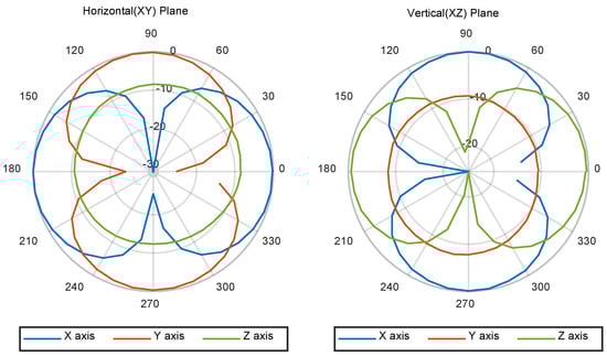 The voltage from the accelerometer was measured; the directivity was then calculated using Equation (2), as shown in Figure 9. Since the accelerometer could only be rotated about one axis, the directivity measurement was performed in both the horizontal and vertical planes. The measurement was performed over 360° with a step angle of 10°. Then, the amplitude of the voltage output at each angle was measured and normalized by the maximum amplitude of output voltages measured in each setup, i.e., in the horizontal and vertical configurations, and then plotted. The test frequency was 0.6-fold of the normalized frequency. Under this condition, the acceleration of the goniometer, as monitored by the reference accelerometer, was not distorted. At a test frequency in excess of 0.8-fold of the normalized frequency, the experimental setup became unstable in that the signal amplitude changed each time the angle of the goniometer was adjusted. The x and y axes both displayed a dipole pattern, while the z axis showed omnidirectional sensitivity because the z axis was orthogonal to the acceleration axis at any angle. For the vertical (XZ) direction, the x and z axes displayed a dipole pattern, while the y axis showed an omnidirectional response, as expected. It was also confirmed that the pair of dipole patterns was orthogonal in the horizontal and vertical directivity measurements.