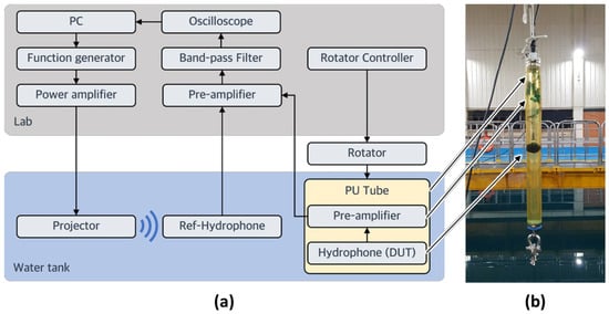 (a) Schematic flow diagram of the underwater experiment. (b) Photograph of the prototype three-dimensional vector hydrophone in the polyurethane tube.