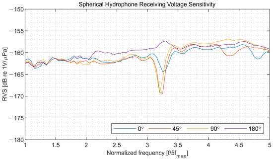 Measured receiving voltage sensitivity (RVS) of the spherical hydrophone with 31.6 dB amplification.