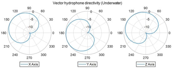 At a normalized frequency of approximately 3.25 (Figure 11), a sharp drop of −10 dB in sensitivity was observed, possibly caused by a feature of the contact boundary between the two hemispherical hydrophones used to make the spherical hydrophone or by an interaction between the 3D accelerometer and the hydrophone. For the 3D vector hydrophone directivity measurement, the hydrophone was rotated using the rotator along a horizontal plane and a vertical plane. The signals were acquired during one revolution at a step angle of 5°. The signals captured from the spherical hydrophone and triaxial accelerometer in each direction were normalized by their maximum output amplitude and delay so that they could be combined to build a cardioid receiving pattern (Figure 12). The directivities along the x and y axes were orthogonal since both signals could be obtained with the same horizontal measurement setup. The z axis displayed a cardioid-shaped receiving pattern as well. Figure 13 shows that the receiving voltage sensitivity of the accelerometer increased linearly; the sensitivities along all axes were similar.
