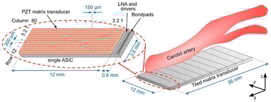 The matrix transducer Is designed for imaging of the carotid bifurcation. We have chosen a center frequency of 7.5 MHz as this is recommended for carotid imaging applications [38]. For the aperture size, we aimed at about 40 mm × 15 mm as the carotid bifurcation is easily accessible and therefore allows for larger apertures. However, manufacturing such a large ASIC in one piece would be very expensive [39]. Thus, we opted to employ a tiled approach where we place multiple smaller and identical ASICs next to each other to create a larger aperture. The final aperture will be 36 mm × 12 mm, which consists of an array of 10 × 1 tiled ASICs of 3.6 mm × 12 mm each. A schematic drawing is shown in Figure 1.