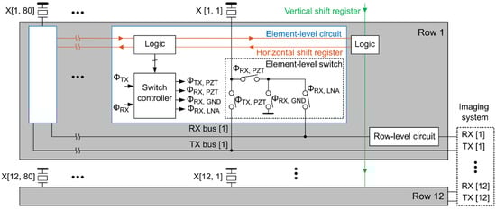 Each RX bus is associated with a shared row-level circuit consisting of a low-noise amplifier (LNA), a programmable gain amplifier (PGA), and a cable driver, which connects the output signal to a receive channel of the imaging system. The various combinations of LNA/PGA gain settings allow the achievement of a programmable gain ranging from −8.6 dB to 32.7 dB with an average step of 2.75 dB. The gain can be changed during the receive phase to make sure the signal level stays within the dynamic range of the ASIC. Each TX bus receives an externally generated high voltage transmit unipolar pulse with an amplitude of tens of volts. The control logic, which is programmed through horizontal and vertical shift registers, determines whether an element participates in a given TX/RX cycle; selects the element configuration for a specific imaging scheme; and sets the gain of the row-level circuit. More details about the current ASIC design can be found in our previous publication [15].