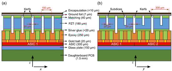 In our previous work [44], in which we investigated the effect of subdicing on a PZT matrix built on top of ASICs, we limited ourselves to the fabrication of a matrix transducer consisting of 4 × 1 tiled ASICs. The main difficulty lay in maintaining a flat surface of the stack over the whole area. The flatness of the stack surface is crucial for the dicing process because the dicing kerfs should be deep enough to guarantee the electrical and acoustical isolation between the elements, but shallow enough to not cut into the ASICs. Unfortunately, ASIC damage during the dicing process was a recurrent problem encountered in our previous attempts to fabricate the matrix.