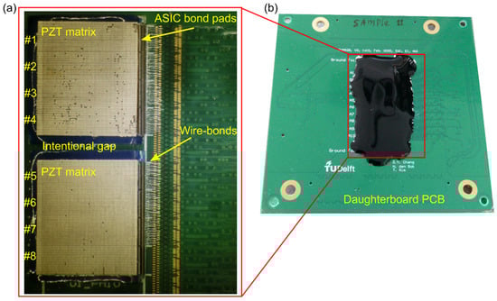A daughterboard (see Figure 5b) was designed to hold the matrix transducer, and to provide the transmit, receive, power, and control signals to the ASIC. The electrical connections from the ASIC bond pads to the daughterboard bond pads were made with a bonding machine using 18 μm thick aluminum wire bonds. Ultraviolet curing glob top epoxy was applied over the bonding wires for protection.