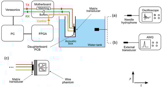 To evaluate the receive performance (see option (b) in Figure 6), an external transducer was utilized as a transmitter and excited with a 3-cycle sinusoidal burst generated by an AWG. We used a pre-calibrated 1 mm circular single-element transducer (PA865, Precision Acoustics Ltd., Dorchester, UK), which was placed at the center of the matrix’s surface (i.e., at the origin of the xy-plane) at a distance z = 300 mm. The received signals of each individual element were acquired with the Verasonics.
