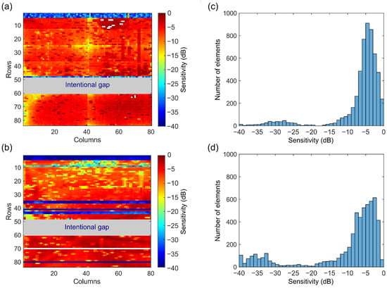 Figure 7c shows the histogram of transmit sensitivity. As can be seen, about 3900 elements are within the 0 dB to −6 dB level. This represents 72% of the elements if we consider only functioning elements (i.e., elements located in defective/missing rows are not counted). In receive, as shown in the histogram in Figure 7d, about 2800 elements have a sensitivity above −6 dB. This represents 58% of the functioning elements.