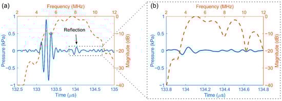 Figure 8a shows the transmit pressure wave for a single transducer element (blue solid line), recorded with the hydrophone at z = 200 mm, together with its fast Fourier transform (red dashed line). Note that there is a second pulse present in the time domain response, with a delay of about 1.5 µs from the main pulse (see black arrow in the figure). This is likely due to reflections from the back side of the ASIC. The second pulse exhibits a peak frequency of about 5 MHz, as seen in the frequency spectrum in Figure 8b.