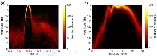 In Figure 9, the time and frequency responses for all working elements of the transducer are presented. In the figure, the color of each pixel represents the count of the number of occurrences in that pixel. In the time domain response shown in Figure 9a, the time delays between the signals have been corrected using cross-correlation.