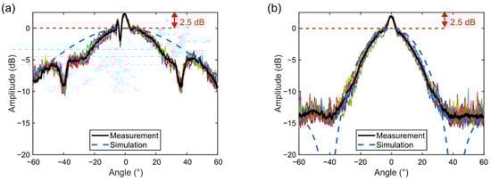 Measured and simulated directivity pattern in transmit. (a) Along the x-direction. (b) Along the y-direction.