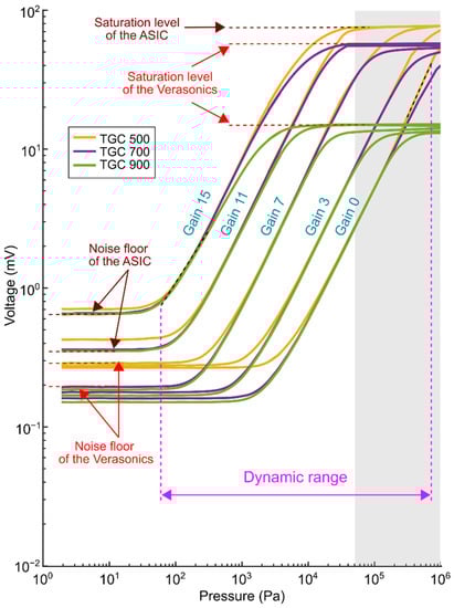 Using the same setup described in the previous paragraph, we have also measured the overall dynamic range, which is defined as the difference between the highest and the lowest detectable pressures. With input pressures ranging from about 1 Pa to 50 kPa, we recorded the received signals for different gain settings of the Verasonics time-gain-compensation (TGC) and the ASIC gain (i.e., the combinations of LNA/PGA gain settings). For the ASIC gains, we used gain levels of 0, 3, 7, 11, and 15, which in decibels correspond to −8.6 dB, 0 dB, 12.1 dB, 23.5 dB, and 32.7 dB, respectively.