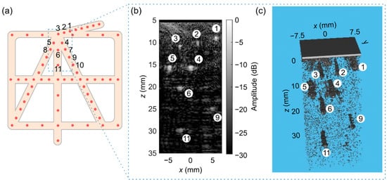 To test the imaging capabilities of the transducer prototype (see option (c) in Figure 6), we imaged a commercial ultrasound phantom for 3D evaluation (model: 055, CIRS, Inc., Norfolk, VA, USA), which contains wires with a diameter of 100 µm. For this test, only the top ASICs (i.e., ASICs 1 to 4) of the prototype were active, which means about 3800 active elements. All the active elements were excited simultaneously to generate a plane wave. In reception, the echoed wavefronts were recorded column-by-column. This necessitates 80 transmit events for recording the data detected by all elements. The raw echo data was filtered using a 50th-order bandpass finite impulse response (FIR) filter with cut-off frequencies of 5 and 9 MHz. The sound speed value used for the reconstruction was 1540 m/s.