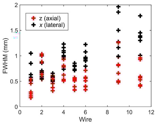 A 3D volume with a lateral/elevation size of about 14 mm covering a depth ranging from 5 to 35 mm was discretized with a pixel size of 100 µm and reconstructed with a delay-and-sum beamforming technique. The reconstruction was conducted using a GPU code developed based on the direct sampling concept [51,52]. The beamformed echo data were first normalized, then log-compressed, and finally, shown with a dynamic range of 50 dB and 30 dB for 3D and 2D representation, respectively. The 3D volumetric image rendering was performed with MATLAB. For quantitative evaluation, the full width at half-maximum (FWHM) of the point spread function (PSF) from wire reflections in the lateral and axial directions was calculated in different elevation planes (from −3 mm to 3 mm, with a spacing of 1 mm) to evaluate the variability of resolution.
