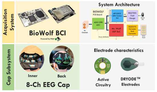 - Kartsch, V.; Tagliavini, G.; Guermandi, M.; Benatti, S.; Rossi, D.; Benini, L. Biowolf: A sub-10-mw 8-channel advanced brain–computer interface platform with a nine-core processor and ble connectivity. IEEE Trans. Biomed. Circuits Syst. 2019, 13, 893–906. [Google Scholar] [CrossRef]