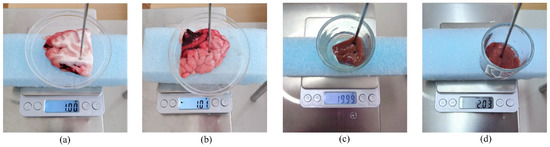 Measurement setup, including the dish with the sample supported by polystyrene on top of a weight scale for bovine (a) brain white matter, (b) brain grey matter, (c) liver, and (d) muscle.