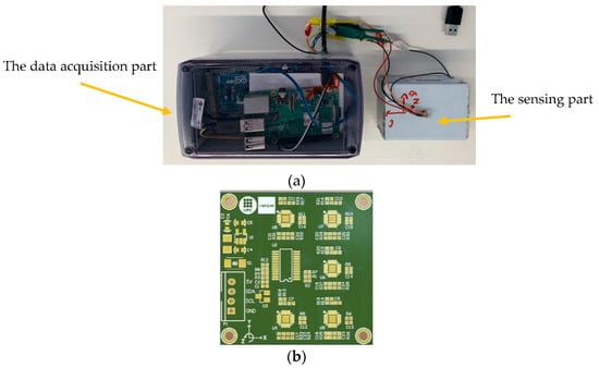LARA: (a) boxed sensing part and data acquisition part of LARA, and (b) PCB design of LARA.