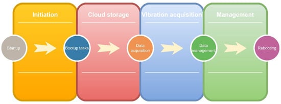 This paper presents an upgraded version of LARA, automatizing its data acquisition process. Figure 2 shows the programmed steps of this, within the following four stages: (1) Initiation: after connecting the Raspberry Pi to any power source, it intends to connect to the Internet. (2) Cloud storage: Automatically mounts a Google Drive and downloads the latest Python code for the data acquisition process if an Internet connection is available. In the absence of the Internet, the present Python code on the hard drive of the Raspberry Pi will be used. (3) Vibration acquisition: at the scheduled date and time, the data acquisition begins, and (4) data management: the finalized acquired data are moved to the Google Drive when an Internet connection is available.