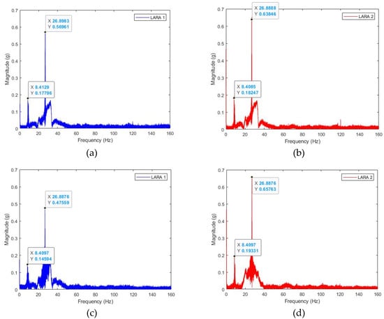 It should also be noted that the results of the eigenfrequency analyses of LARA 1 and LARA 2 before and after fixing their sampling frequency should be the same. To demonstrate this, eigenfrequency analyses were performed on the time domain responses presented in Figure 3b,c and Figure 4a,b, which show the eigenfrequency analysis of LARA 1 and LARA 2, respectively, before fixing their sampling frequency using the resampling MATLAB function. Furthermore, Figure 4c,d show the eigenfrequency analyses of LARA 1 and LARA 2, respectively, after fixing their sampling frequency at the rate of 333 Hz.