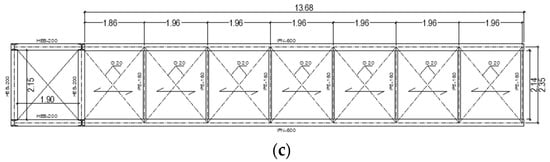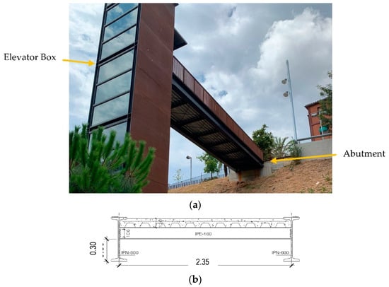 First, the studied structure (Polvorines’ Footbridge in Barcelona, Spain) is shown in Figure 5a. As shown in this figure, the structure is connected to an elevator box and on an abutment. Figure 4c and Figure 5b present the section and plan of the bridge, respectively. This bride is 13.68 m long and 2.35 m wide. The primary beams are IPE600 beams located in the footbridge’s longitudinal direction. In addition, the transverse beams are IPE160. The deck of this bridge is composite and has been modeled in the software with the shell-thin element with a thickness of 120 mm.
