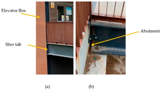 From Figure 6a, it is clear that the bridge is connected to the elevator box using a shear tap [79]. Figure 6b shows the other support of this footbridge. As shown in Figure 6b, the bridge can freely move along its longitudinal axis. In fact, only the translation Z and Y directions are restrained on these supports.