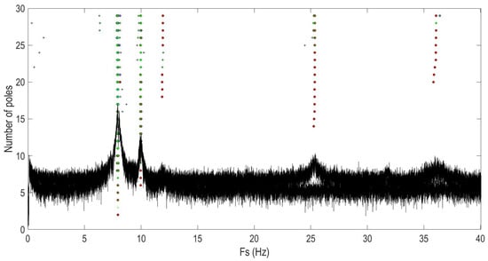 The basic idea behind frequency domain techniques is to calculate the modal parameters from quantities (such as magnitude, phase, and half-bandwidth) related to the spectral response function’s peak values. SSI algorithms, on the other hand, approach this problem from a time domain point of view, modeling the obtained timeseries as the output of an analogous linear system whose governing equations are entirely characterized by the linked state–space matrices [36]. The primary benefit of SSI approaches over traditional spectral alternatives is that they are entirely unsupervised [37].