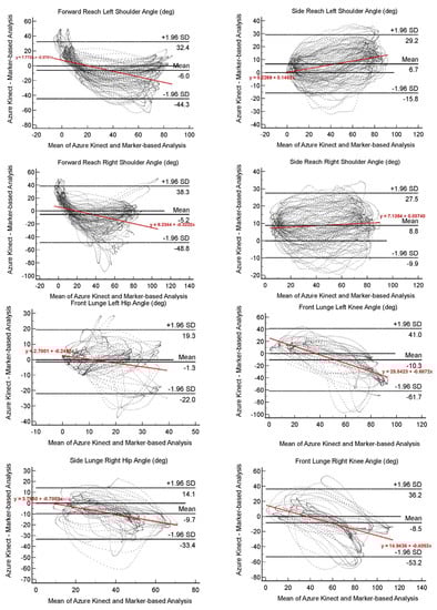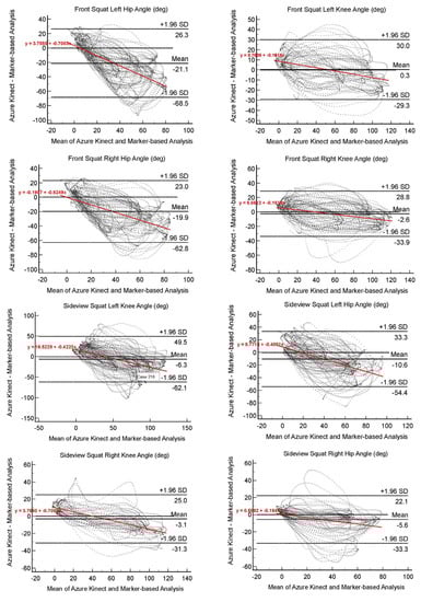 Table 1 displays the R, R2, and ICC for the overall data between the Azure Kinect and the marker-based motion analysis. During the front view of squat motions, hip joint angles showed moderate concurrent validity (right hip, ICC 3.1 = 0.6302; left hip, ICC 3.1 = 0.5274), while knee joint angles showed a high level of concurrent validity (right knee, ICC 3.1 = 0.8989; left knee, ICC 3.1 = 0.9076). The side view of squat motions showed moderate to good concurrent validity for hip joint angles (right hip, ICC 3.1 = 0.8251; left hip, ICC 3.1 = 0.6378), while knee joint angles showed variation between excellent and moderate concurrent validity (right knee, ICC 3.1 = 0.9185; left knee, ICC 3.1 = 0.6625). The forward reach motions showed moderate concurrent validity for both shoulder angles (right shoulder, ICC 3.1 = 0.7068; left shoulder, ICC 3.1 = 0.7816), while the lateral reach motions showed excellent concurrent validity (right shoulder, ICC 3.1 = 0.9235; left shoulder, ICC 3.1 = 0.9069). During the front view of lunge motions, both hip and knee joint angles showed moderate concurrent validity (right hip, ICC 3.1 = 0.6929; left hip, ICC 3.1 = 0.5645; right knee, ICC 3.1 = 0.6821; left knee, ICC = 0.5826). The side view of lunge motions showed variations in concurrent validity, while the right hip joint angle showed good concurrent validity, and the left hip joint showed poor concurrent validity (right hip, ICC 3.1 = 0.7843; left hip, ICC 3.1 = 0.2868).