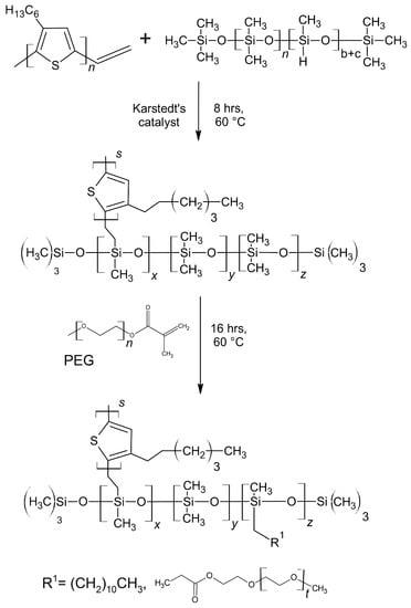 The synthesis of the vinyl-terminated regioregular poly(3-hexylthiophene) (vin-rrP3HT) via the Grignard metathesis method was conducted based on the procedure described in the literature [30]. All of the reagents were purchased from Sigma Aldrich, Saint Louis, MO, USA. The average molecular weight (MN) of vin-rrP3HT was approximately 10,000 g/mol, as determined by the gel permeation chromatography. The investigated graft copolymers were obtained using the method described in the patent application [31] The synthesis was based on the grafting of the vinyl terminated rrP3HT with a poly(ethylene glycol) (PEG) methyl ether methacrylate (MN 950 g/mol) or dodec-1-en onto poly(dimethylsiloxane-co-methylhydrosiloxane), trimethylsilyl terminated) MN 950 g/mol (poly(DMS-co-MHS)) chains (Sigma Aldrich, Saint Louis, MO, USA). Receiving accordingly (poly(DMS)-co-[poly(MHS)-graft-2-vinyl-poly(3-hexylthiophene)]-co-[poly(MHS)-graft-PEG]) (SilPEG) and (Poly(DMS)-co-[poly(MHS)-graft-2-vinyl-poly(3-hexylthiophene)]-co-[poly(MHS)-graft-dodec-1-en] (DodecSIL). The scheme of the synthesis of the obtained rrP3HT graft copolymers is presented in Figure 1.
