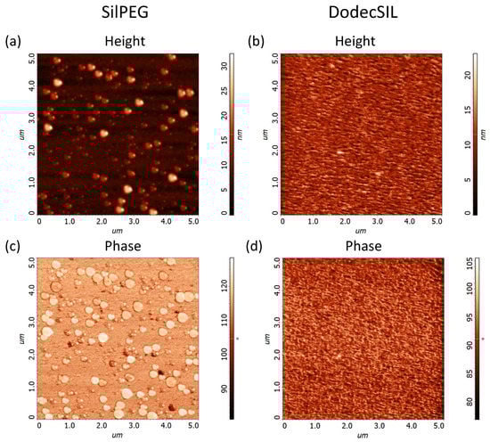 AFM images of polymer films from μm area: (a) SilPEG height (RMS = 3.7 nm) (b) DodecSIL (RMS = 2.3 nm) height; (c) SilPEG phase; (d) DodecSIL phase.