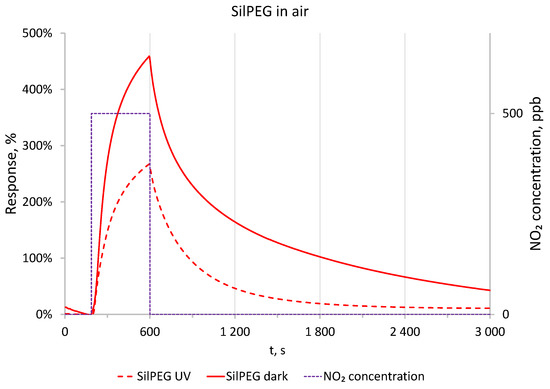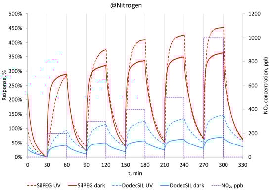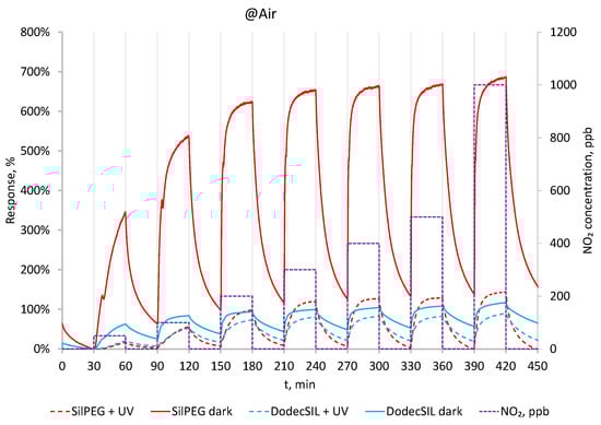 In general, the response of SilPEG to NO2 is higher than that of DodecSIL, regardless of N2/air atmosphere or the presence/absence of UV irradiation.