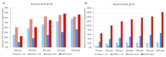 The baseline drift of the sensors is a very important issue. In Figure 7, the short-time baseline drifts of sensors after 30 min regeneration in carrier gases (after each examined NO2 concentration) are presented. In nitrogen carrier gas (Figure 7a), the drifts exceed 10% in all cases and are comparable in both dark and UV conditions for both polymers. The drift values are proportional to the concentration of NO2, which is the result of incomplete regeneration of the sensors after each single gas dosing cycle. There is no significant improvement in baseline stabilisation, and for DodecSIL, the baseline drift even increased when UV activation was applied.