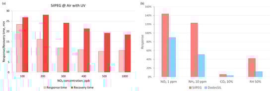 (a) Response and recovery times for SilPEG in air with UV; (b) selectivity of the polymers in air conditions with UV activation.