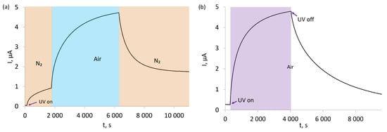 In the first experiment (Figure 9a), the sensors were subjected to continuous UV irradiation while being immersed in pure N2 atmosphere. This irradiation leads to the photogeneration of charge carriers, which is observed as an increasing current flowing through the sensing structure. The current increase is initially fairly rapid, but quickly slows down as the concentration of photogenerated charge carriers becomes sufficient for their recombination to become significant. Once the N2 atmosphere is replaced with air, another similarly shaped current increase is observed, but with a much greater magnitude than for the N2 atmosphere. Once air is replaced with N2,this increased current quickly decays and gradually stabilises at an intermediate level.