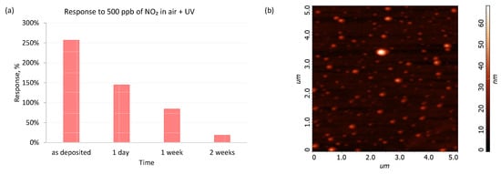 (a) Response of SilPEG to 500 ppb of NO2 in air under long-term continuous UV illumination; (b) AFM image of SilPEG after two weeks aging under UV in air.