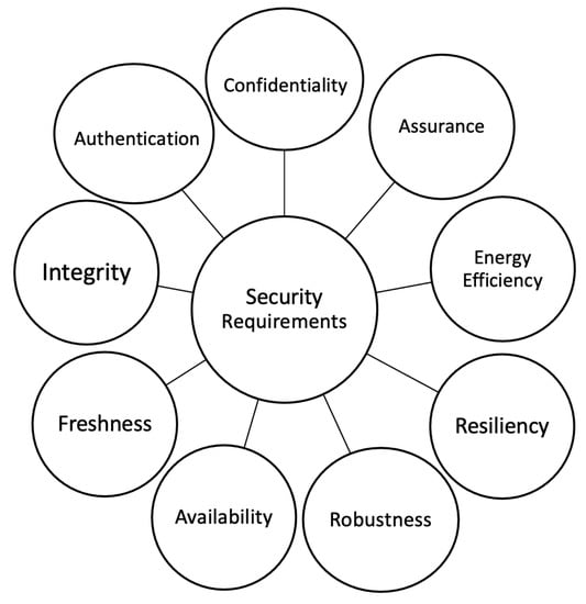 The security requirements for 6LoWPAN are specified by the Network Working Group in RFC 4919 [], and include integrity, confidentiality, availability, freshness, assurance, energy efficiency, resiliency, robustness, and authentication, as seen in Figure 2.