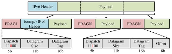 6LoWPANs are networks specifically designed for wirelessly connecting devices with restricted power and memory. The specifications of 6LoWPANs are as follows: devices are of limited power (usually battery operated), devices are placed in an ad-hoc manner, a generally large number of devices, devices tend to be unreliable, networks are of lower bandwidth rates (250 kbps–20 kbps), and, most importantly, a maximum MAC layer frame size of 127 bytes. The maximum size of frames in 6LoWPAN is 127 bytes, and the IPv6 packets need a Maximum Transmission Unit (MTU) of 1280 bytes []. If the packet size is less than the maximum payload length of 6LoWPAN, it will be sent directly without any fragmentation []. Otherwise, it must be fragmented into smaller sizes if it does not fit the specified frames. The adaptation layer performs this fragmentation in 6LoWPAN [].