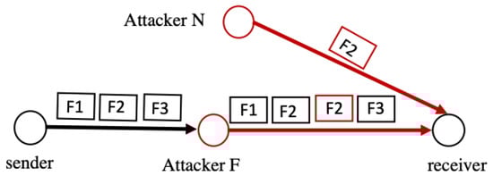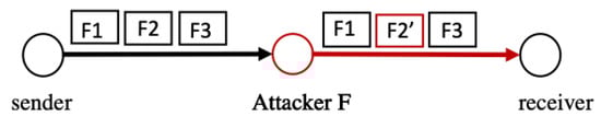 Alteration attacks exploit the lack of fragment integrity verification in the adaptation layer in 6LoWPAN. An insider attacker who is part of the forwarding path (F) receives the fragment, alters the payload, and forwards it to the next node, as seen in Figure 6. The receiving end cannot detect the forged fragment []. This attack violates the integrity and availability of the data, as the transmitted data may be altered or damaged, and prevents the reassembly of the packet fragments.