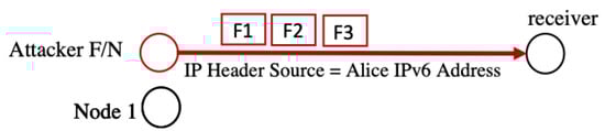 Spoofing attacks are based on an attacker impersonating another entity by binding its IP address with the victim’s MAC address or its own MAC address to the victim’s IP address []. They may be harmful in several ways. For instance, an insider attacker (N or F) impersonates another node (e.g., Node 1) and issues fragments with Node 1’s IP address as the source ID within the FRAG1 header. The attacker sends the forged fragments to another node, which believes that the fragments’ source is, in fact, Node 1. The forged fragments may contain false or harmful data that harm the target node. Another scenario is when an attacker binds its IP address with Node 1’s MAC address and directs all the incoming traffic away from Node 1 [], as illustrated in Figure 7. Spoofing attacks take advantage of the lack of a sender-authentication mechanism in the 6LoWPAN. Spoofing could be used to carry out future attacks such as DoS, distributed DoS, flooding attacks, and man-in-the-middle attacks. Thus, it can prevent the victim node from creating relationships with neighbors. DoS attacks can be created by attaching the MAC address of the attacker to the victim’s IP address, causing the victim node’s inability to register itself to the router, which leads to a corrupted routing table. The spoofing attack damage will persist until the attacker node is detected [].
