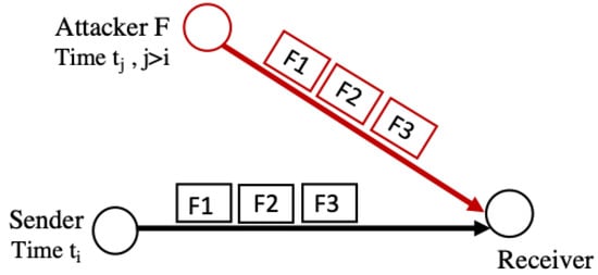 Replay attacks aim to overwhelm the 6LoWPAN with fragments that were previously received. These attacks exploit the lack of a mechanism to check the freshness of the data in the 6LoWPAN adaptation layer []. In the given scenario, the insider attacker (F) receives fragments, stores them, then forwards them. Later on, F re-sends the same fragments, exploiting the fact that the receiving node will not know that the fragments were received earlier. Replay attacks are depicted in Figure 8. This attack exhausts resources with the replayed fragments, thereby delaying the transmission of legitimate fragments or causing DoS [].