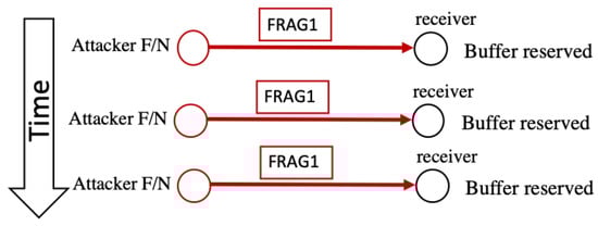 As shown in Figure 9, buffer reservation attacks exploit the nodes’ limited resources in 6LoWPANs. The vulnerability exploited in this attack is that the receiving nodes need to reserve enough space within their buffer, as indicated by the packet size in the FRAG1 header. Space is used to reassemble the entire packet from the received fragments. A node cannot receive other fragments if its buffer is reserved or occupied. In 6LoWPAN, the standard time-out limit to reassemble a packet is 60 s. When the transmission period times out, the node discards the unassembled fragments. An insider attacker (F or N) sends a fragment with header FRAG1 to the victim node in this attack. The victim node reads the packet size (in the datagram field), reserves the buffer’s space accordingly, and awaits the remaining packet fragments. However, the attacker does not send the remaining fragments, and when the time-out limit is reached, the attacker again sends the FRAG1 fragment, which reserves the buffer again. If this attack continues, the victim node can never receive any legitimate fragments and is tied up attempting to process the attacker’s malicious fragments [].