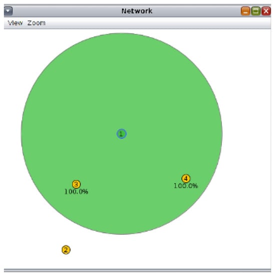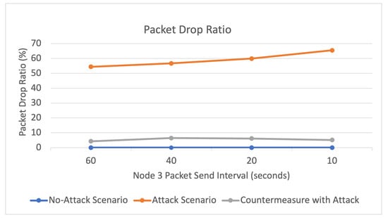 As depicted in Figure 16, and Table 5, there were 0% dropped data packets in the normal network scenario. In the attack scenario, the packet drop ratio increases from 0% to more than 50%, as more than half of the sent data packets are dropped due to the attack. Furthermore, it can be observed that the drop ratio increases as the attacker node (Node 3) shortens the interval of sending malicious packets. This is because more malicious packets are sent by the attacker and consequently dropped by the victim as it waits for the remaining fragments. Moreover, it is evident that the countermeasure dramatically decreases the packet drop ratio by more than 50%. This is because the victim node can receive more packets after the attacker node is blocked. Thus, as the attacker’s reputation score declines and ultimately reaches a point where the victim node blocks its malicious FRAG1s, the target node no longer receives the FRAG1s and does not drop the malicious packets. This reflects the success of the countermeasure in mitigating the attack. As the results clearly show, the victim node no longer receives the malicious FARG1s and therefore does not waste time waiting for the remaining FRAGNs.