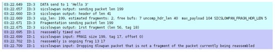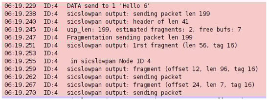 When the receiver receives fragments, it starts constructing the original packet []. The receiver identifies fragments based on three values: the link layer source and distention addresses, the datagram size, and the datagram tag []. The receiver uses the datagram offset to place the packet on its appropriate location in the reassembly buffer [,]. The receiver reserves space on the buffer with the value stated in the datagram size field. If the receiver receives a fragment that overlaps with currently buffered fragments, it should discard the saved fragment and keep the fresher one. Moreover, the receiver should start a timer upon the packet’s reassembly; if all fragments are not received before the time-out, all fragments must be discarded []. The memory requirement for each reassembly buffer entry is at least 1302 bytes, which should be reserved by the node for the reassembly [].
