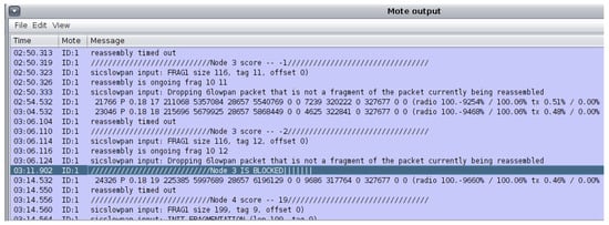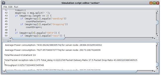 A Javascript script was written and run during the execution of each scenario using the simulation script editor available from Cooja’s tools to compute these defined metrics. The script analyzes the log listener and provides real-time statistics as defined in the written script. The script editor is shown in Figure 15.