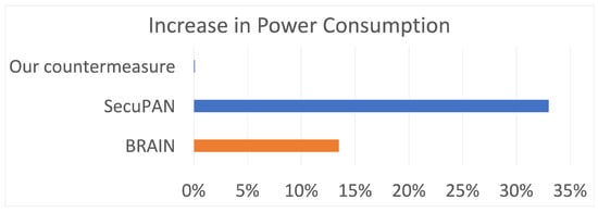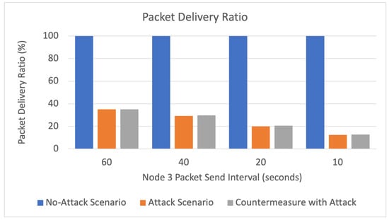 Regarding PDR, our countermeasure causes an average decrease of PDR across different packet sending intervals of 53.6%, which is 36% better than the improvement in PDR reported in BRAIN []. Unfortunately, [] did not report the improvement in PDR with their proposed countermeasure SecuPAN; hence, we cannot compare our method to [].
