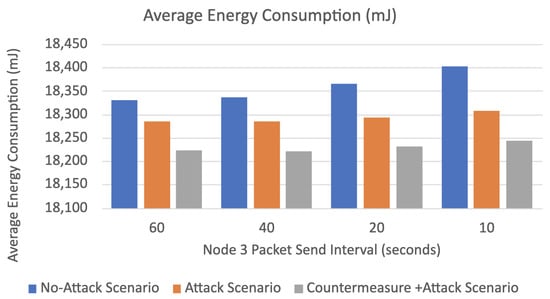 As depicted in Figure 19 and Table 5, the average energy consumption of the network in the no-attack normal mode is more than in the other two scenarios because all the packets are legitimate in this scenario. Therefore, all packet fragments are sent and delivered to their destination. Hence, more energy is consumed as more packets are delivered in this case. Most importantly, we can see that the countermeasure decreases the average energy consumption in each attack interval during the attack. The average power consumption decrease is around 64 mJ compared to the second scenario (attack without the countermeasure). This is because the victim node without the countermeasure receives the malicious FRAG1 packets and consumes more energy waiting for the remaining FARGNs until the timeout is reached. However, with the countermeasure, the target node, according to the attacker’s reputation score and repetitive malicious behavior, actively blocks the attacker’s FRAG1 packets and does not wait for the remaining fragments. Therefore, the target node consumes less energy than the attack scenario without the countermeasure. It is worth noting that the decrease in energy consumption is relatively small.