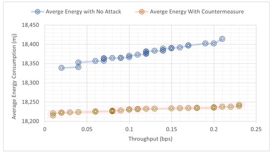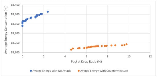 Sensors in WSNs are energy-constrained devices with limited power supply; hence, power consumption is one of the major performance metrics that needs to be investigated and used to show the effectiveness of our proposed countermeasure. We examined the correlation between average energy consumption with (a) packet delivery ratio and (b) throughput as illustrated in Figure 20 and Figure 21, respectively. Figure 20 shows that our proposed countermeasure achieves similar throughput as the no-attack normal mode while consuming less energy. Similar results are found in Figure 21, where our proposed countermeasure achieves similar packet drop ratio as the no-attack normal mode while consuming less energy.