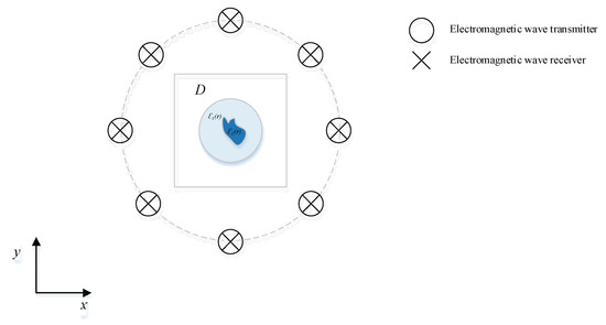 denotes the second class of Hankel functions [27], denotes the number of waves in free space, is the source point of the object domain D, denotes the position vector at the receiver, denotes the total field, expressed as , and is the relative permittivity of the target scatter.