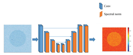 When the proportion of pest communities in the cross-section of trees is less than 10%, the inversion results will be noisy. If the proportion of the pest community in the cross-section of the tree becomes smaller and smaller, the noise of the inversion image becomes denser and denser. To solve this problem, an image optimization and image reconstruction technology is introduced: Real-ESRGAN [32]. The Super-Resolution algorithm can not only improve the resolution of the inversion image but also optimize the image quality and remove the dryness of the image. Real-ESRGAN uses a U-Net discriminator with spectral normalization [33,34,35], which can identify where the noise is and where the pest community is located. Its network structure is shown in Figure 5.