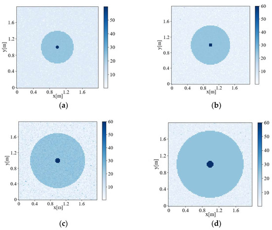 Inversion images with the same inversion ratio and different sizes: (a) 0.04 m radius of pest community; 0.4 m radius of the living tree, (b) 0.05 m radius of pest community; 0.5 m radius of the living tree, (c). 0.07 m radius of pest community; 0.7 m radius of the living tree, and (d) 0.08 m radius of pest community; 0.8 m radius of the living tree.